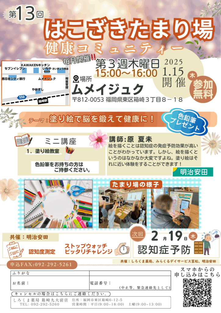 \毎月開催!/健康コミュニティ「はこざきたまり場」も継続します。